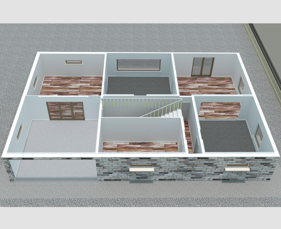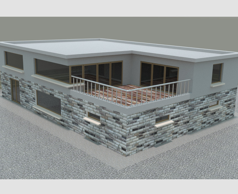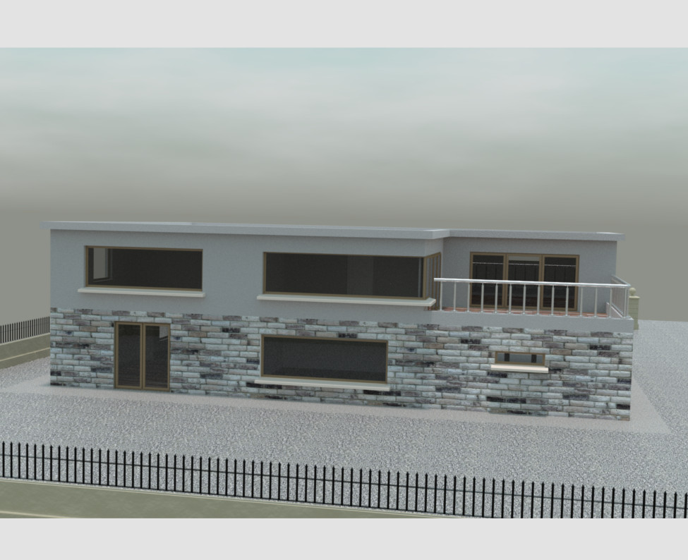 After working through the drafting techniques and adding windows, doors, dividing walls and a staircase, I used the 2D data to extrude the external walls & make a 3D model. To achieve realistic detail on the house I texture mapped the bricks, gravel drive way, exterior ground walls, windows, doors etc using similar techniques.