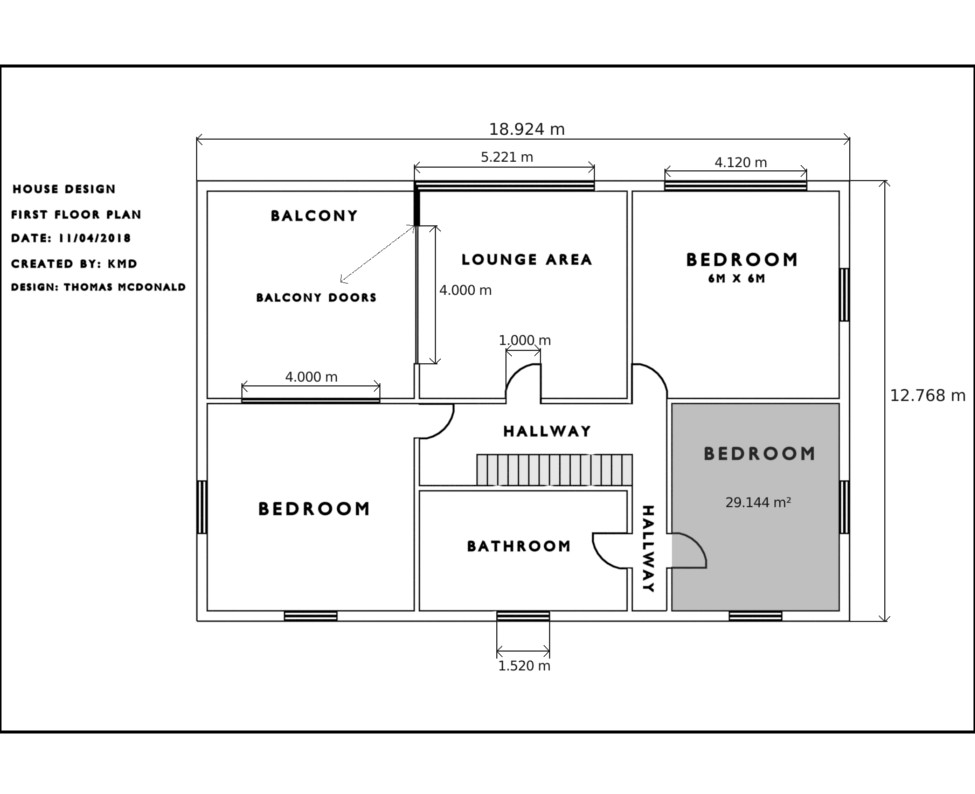 I began by drafting a relatively simple two story house with a balcony area and garage. I started designing a 2D plan as a basis for logging my measurements and dimensions.