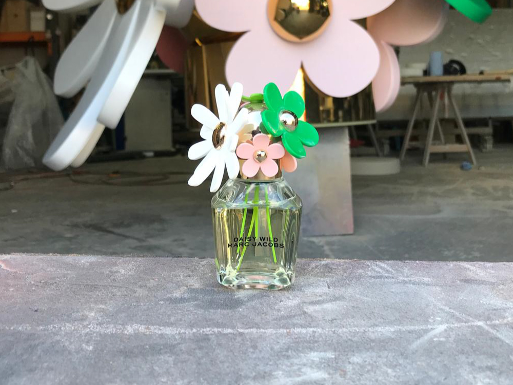 I designed the bottle in Blender to create the curved forms and after a 3D-Printed prototype was established the sections were assembled and finished by the talented team at Rocket Art. The team also made the flower bottle top to complete the finished look.