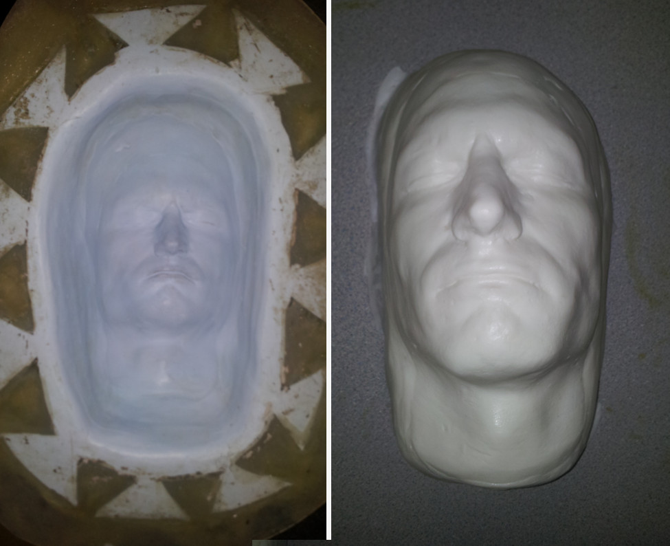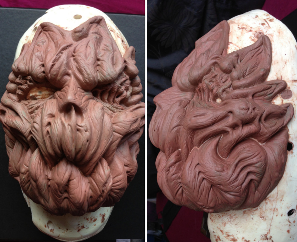 I made this pumpkin mask for a halloween haunt night at Warwick Castle some years ago. After taking a lifecast of the actor, I then sculpted a design that allowed for the jaw to open and close when the actor spoke. I made an RTV silicone mould with a hard putty shell to give support when casting. The mask was cast in Polytek Flexible Polyurethane Rubber and tinted with an orange pigment. It was painted using thinned down enamel based paints and mounted onto a leather hood with some blunt nails glued in place. The body suit was built was made from a morph suit, soft foam, liquid latex and acrylic paints.