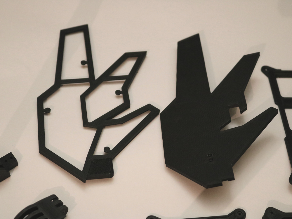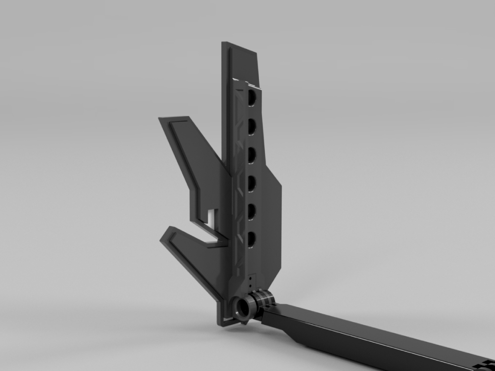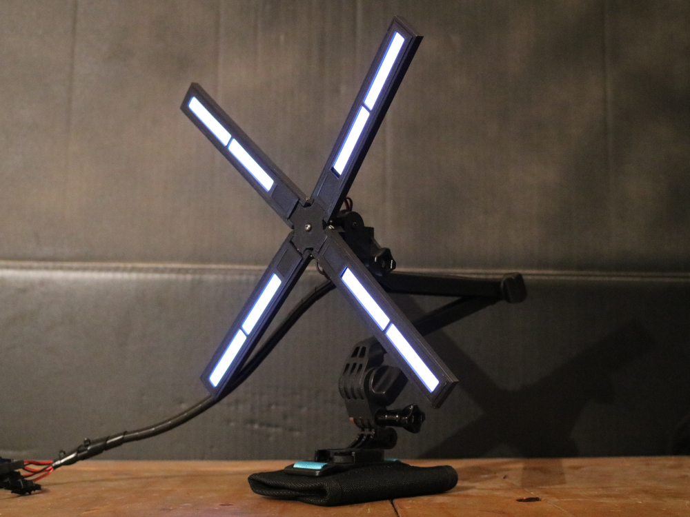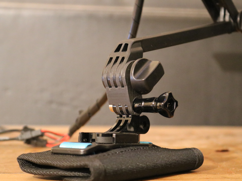 I modelled all the parts in Fusion 360 using a GoPro 3-Way Tripod Mount as a start point to minimize the amount of 3D printing needed for something like this to function and the tripod mount is a much stronger material than can be produced by FDM printing. I also wanted both designs to be collapsible and to sit comfortably on the wearers shoulder when not in use, so I designed a small adapter that would allow for the Tripod Mount to attach to a padded GoPro Backpack Strap Mount - enabling each prop to fit onto any backpack. There are a few external wires that can easily be zip-tied up or placed inside some cable housing to lead the electronics and battery into the backpack.