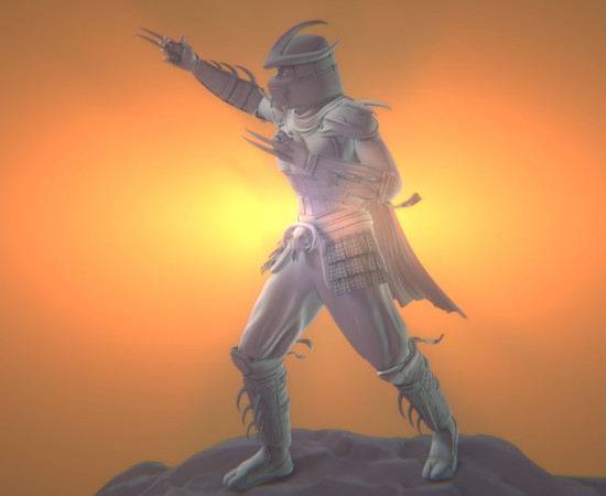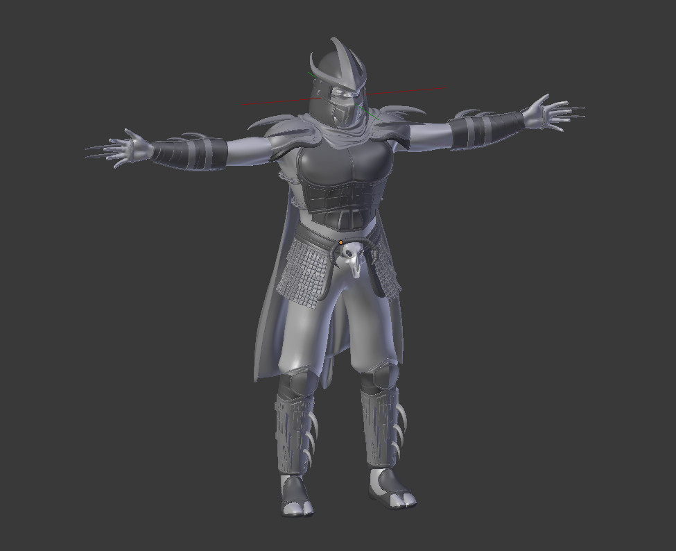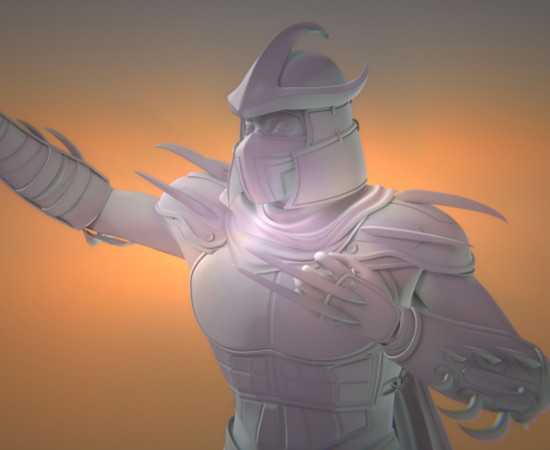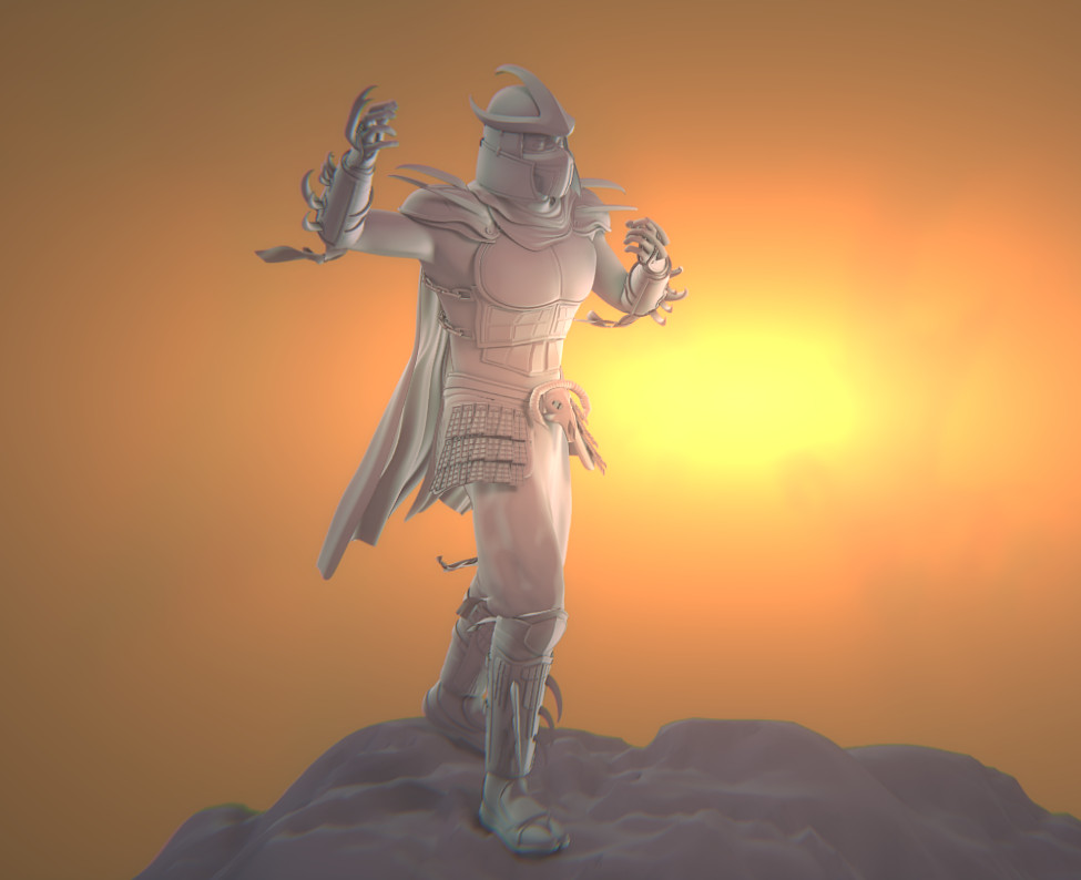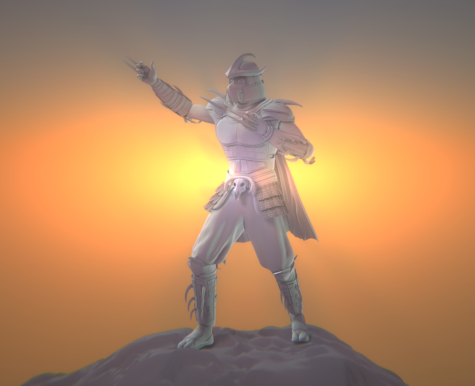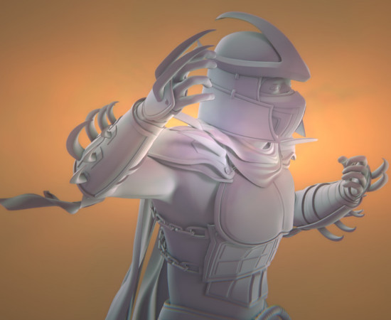 After achieving the basic forms using reference images of human anatomy as a guide, I then modelled additional details such as the clothing and armour. I also used Blenders physics engine to make the cloth look more organic by adding a wind simulator. Wanting to veer away from the tutorial slightly, I tried my hand at modeling the ninja turtles arch nemesis 'Oroku Saki' (The Shredder) loosely based on the original comics design. Using Blenders scene options and node editor I was able to get some nice filters on my final renders and give them a stylized appearance. Stage two will be to texture, colour and animate the character.