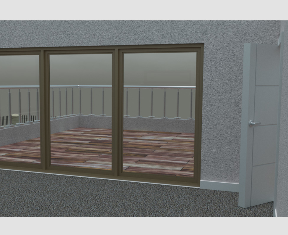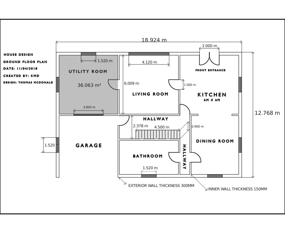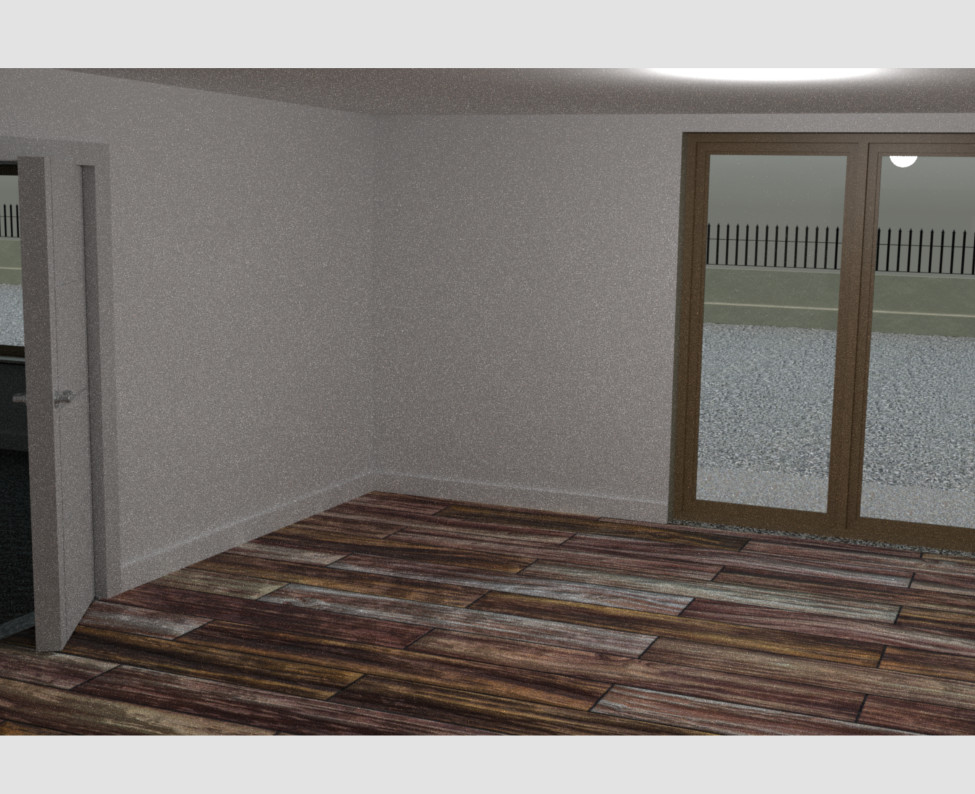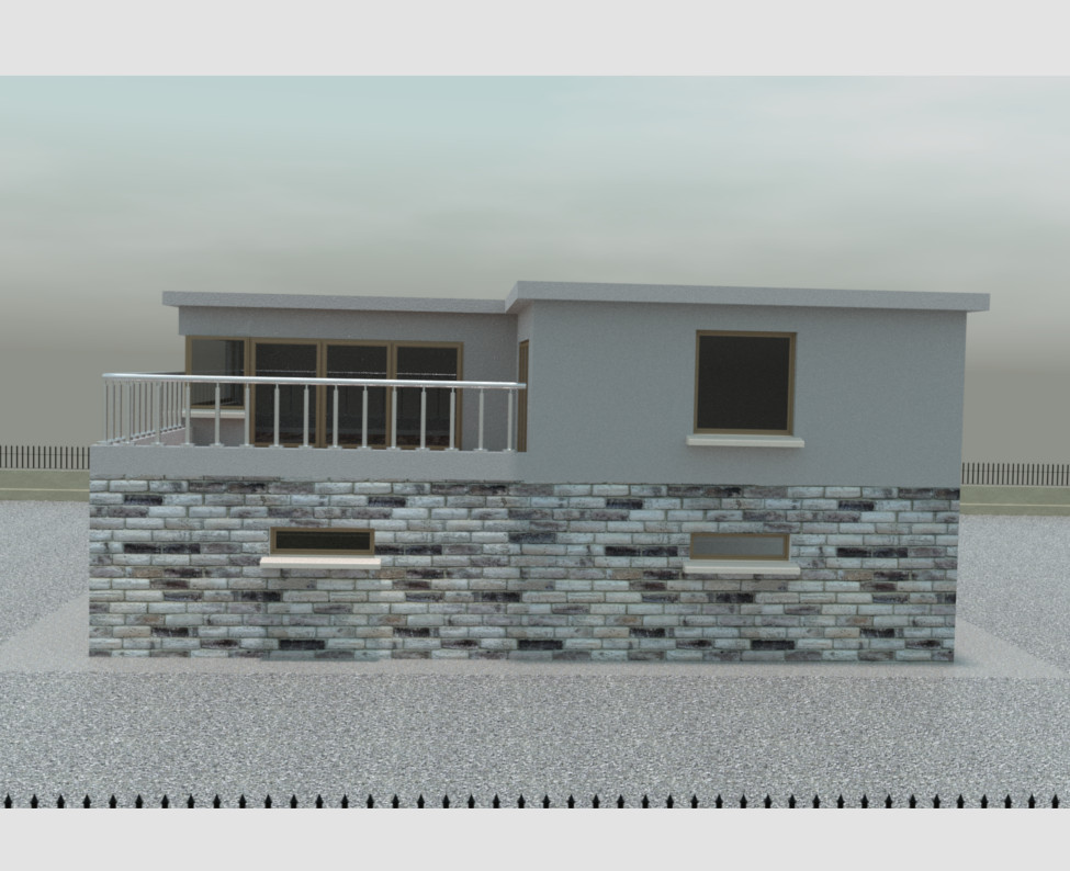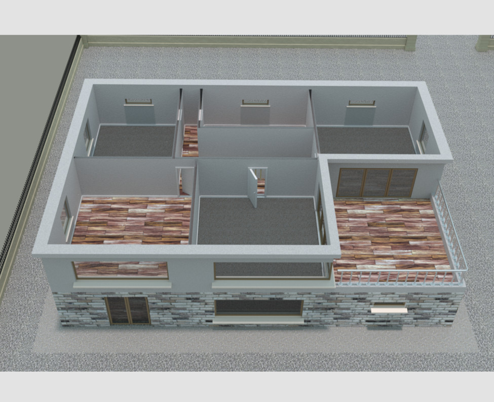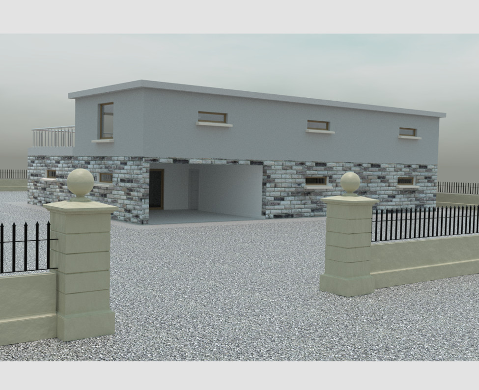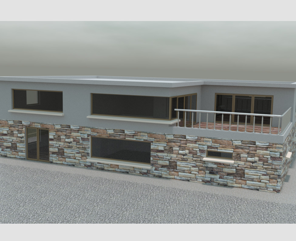 After working through the drafting techniques and adding windows, doors, dividing walls and a staircase, I used the 2D data to extrude the external walls & make a 3D model. To achieve realistic detail on the house I texture mapped the bricks, gravel drive way, exterior ground walls, windows, doors etc using similar techniques.