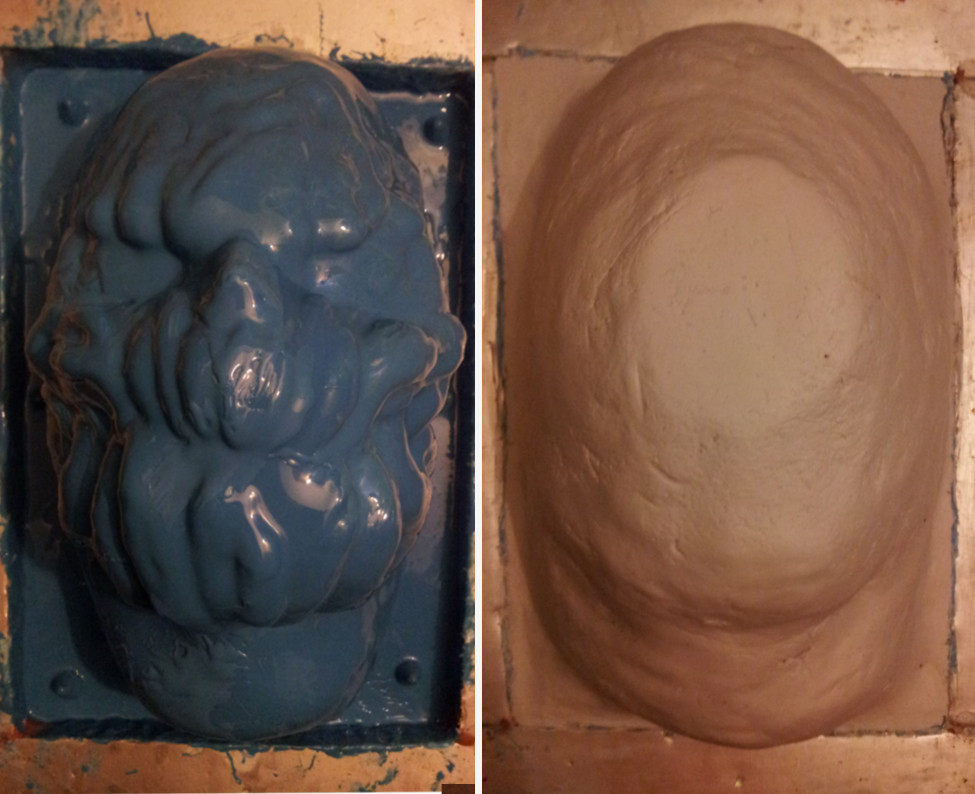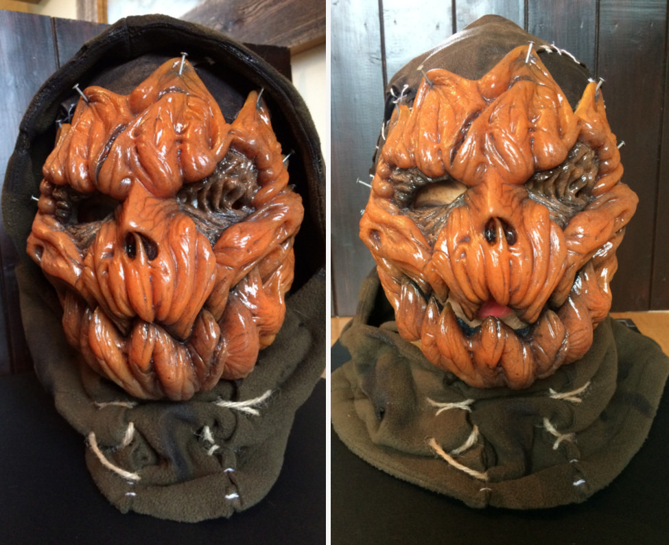 I made this pumpkin mask for a halloween haunt night at Warwick Castle some years ago. After taking a lifecast of the actor, I then sculpted a design that allowed for the jaw to open and close when the actor spoke. I made an RTV silicone mould with a hard putty shell to give support when casting. The mask was cast in Polytek Flexible Polyurethane Rubber and tinted with an orange pigment. It was painted using thinned down enamel based paints and mounted onto a leather hood with some blunt nails glued in place. The body suit was built was made from a morph suit, soft foam, liquid latex and acrylic paints.