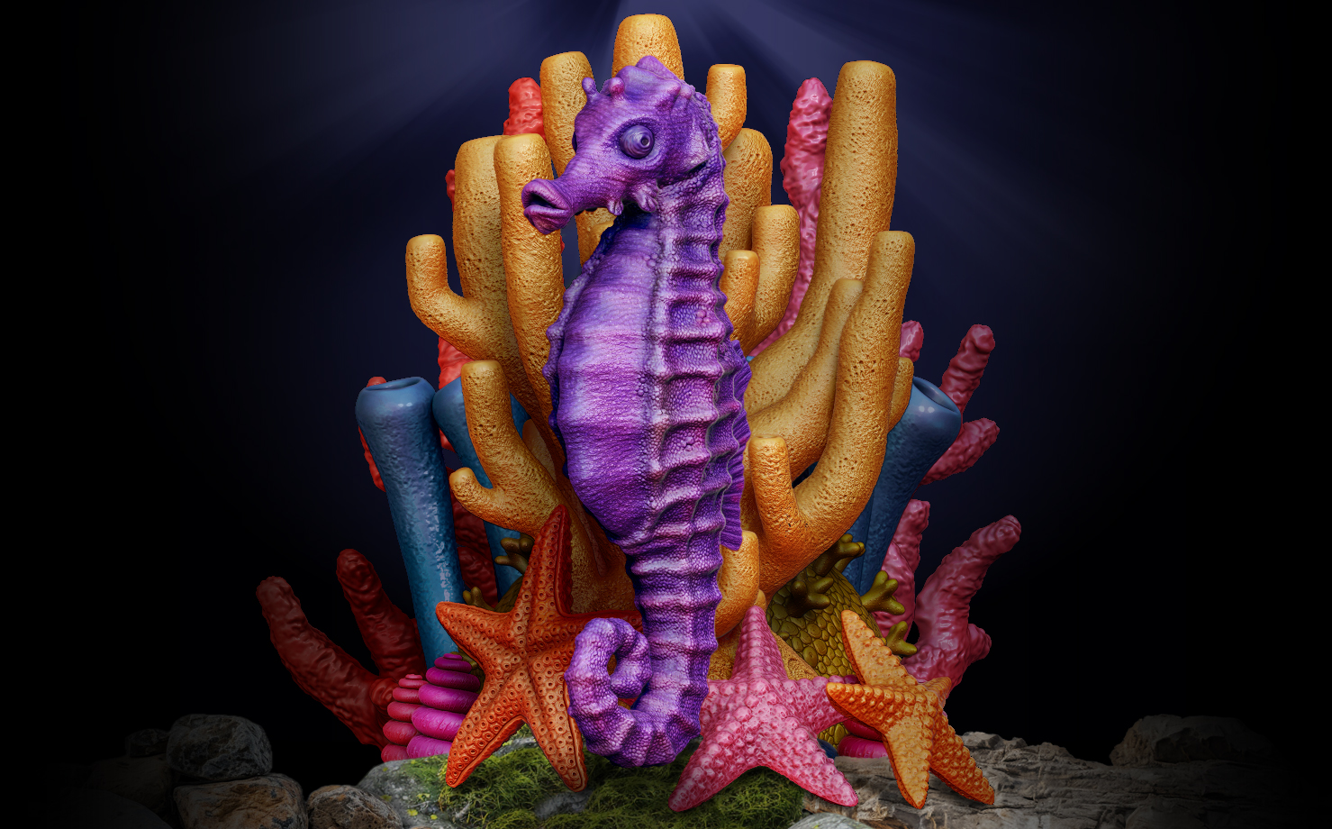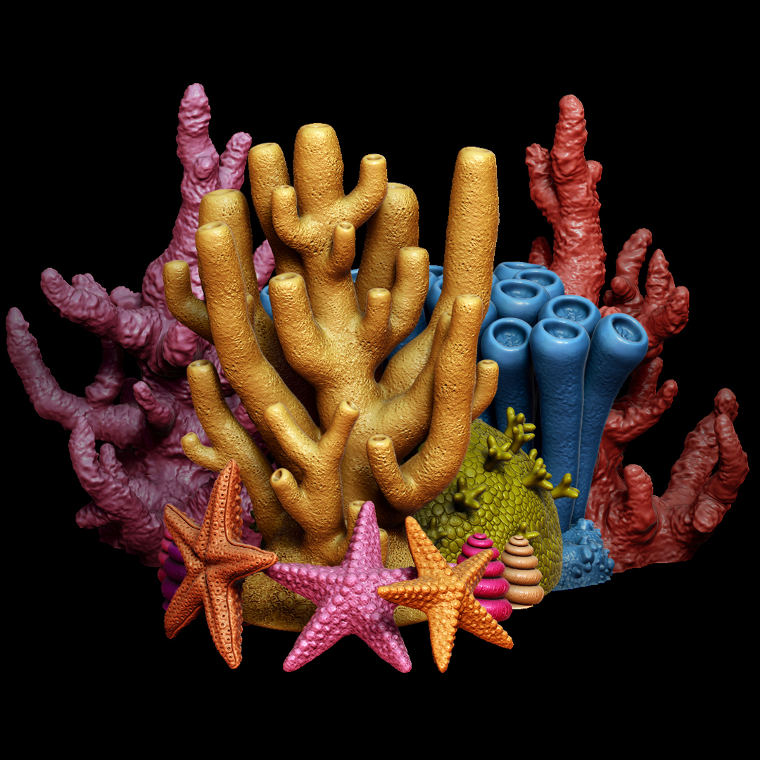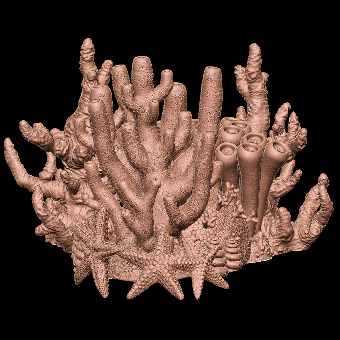 Here are a few images of the models and I put them all together to make a little underwater scene. The render was finished in Photoshop using separate layers of colour & materials with varying grades of opacity to create depth and shadow. Some simple Photoshop tricks were used to add a few rocks and lighting effects.