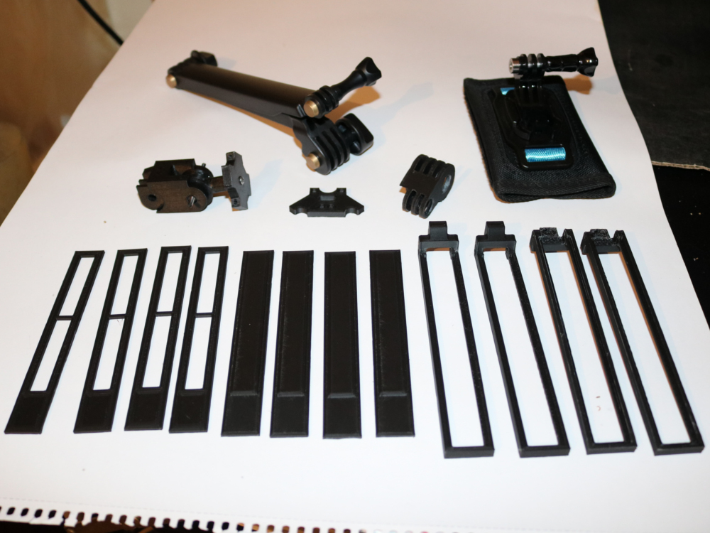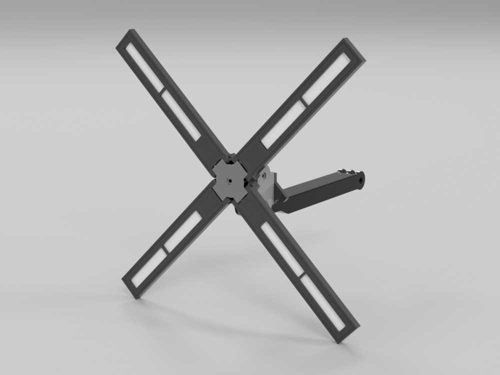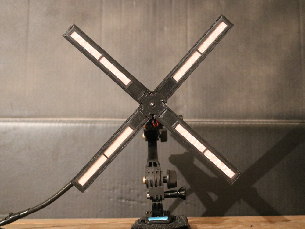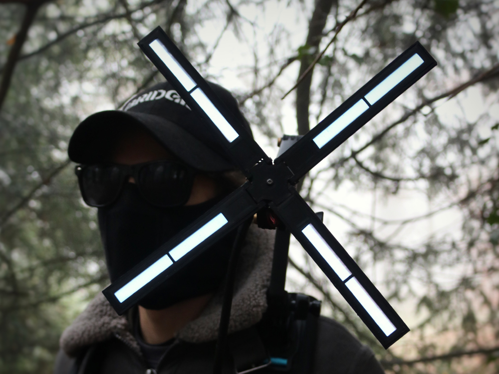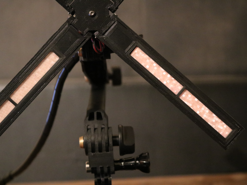 I modelled all the parts in Fusion 360 using a GoPro 3-Way Tripod Mount as a start point to minimize the amount of 3D printing needed for something like this to function and the tripod mount is a much stronger material than can be produced by FDM printing. I also wanted both designs to be collapsible and to sit comfortably on the wearers shoulder when not in use, so I designed a small adapter that would allow for the Tripod Mount to attach to a padded GoPro Backpack Strap Mount - enabling each prop to fit onto any backpack. There are a few external wires that can easily be zip-tied up or placed inside some cable housing to lead the electronics and battery into the backpack.